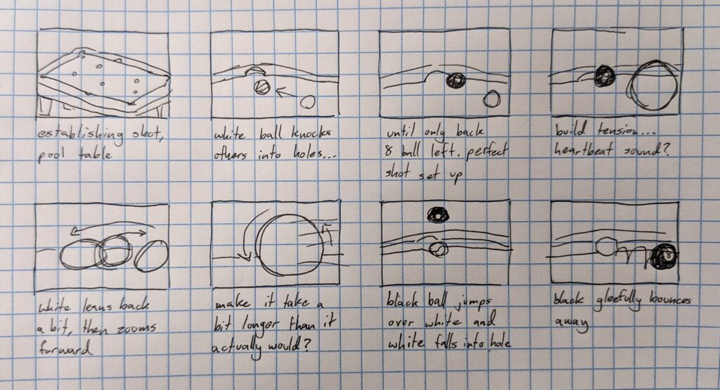 For the later half of the animation, I used staging to put the white ball and black eight ball in the same frame. I used anticipation and squash and stretch to build suspense when the white ball is getting ready to roll. I exaggerated the squishing and jumping of the black eight ball to make it seem a lot softer than the other balls. I deliberately chose to make the other balls not squish as much. I also wanted to give the black ball a little personality at the end with the way it turns around and looks back at the camera.